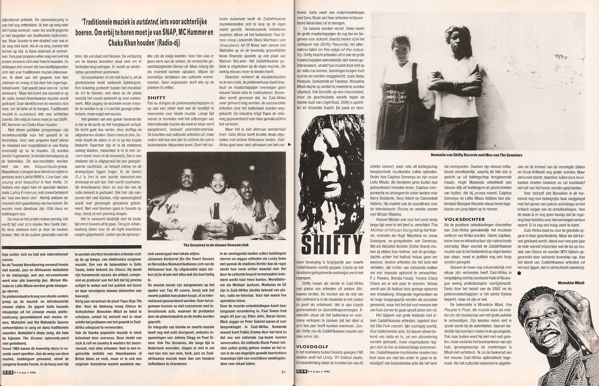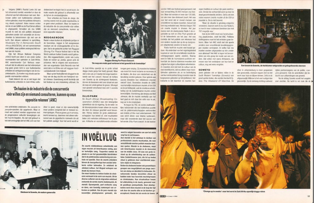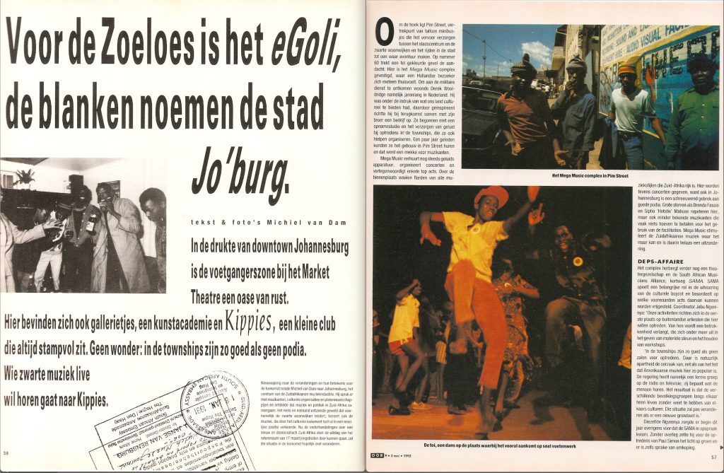 In 1991 werden de apartheidswetten ingetrokken. Nieuwsgierig naar de veranderingen die dat voor de muziekwereld zou geven reisde Michiel van Dam in naar Zuid-Afrika. Daar werd hij omhooggesleurd door de stroom veranderingen die niet meer te stoppen en ook voor de Zuid-Afrikaanse muziekscene enorm belangrijk waren. Het boeiende verslag van deze reis was in nummer 09/1992 van het Toonaangevende Tijdschrift OOR te lezen.